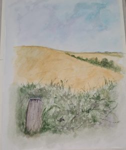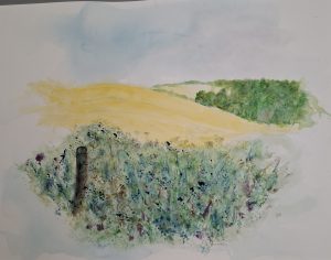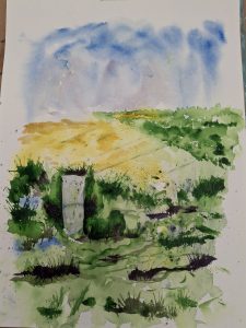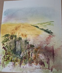 We studied an image of the landscape of Lathkilldale, Derbyshire. Using watercolours the group produced a finished painting following step by step instructions from Joe.